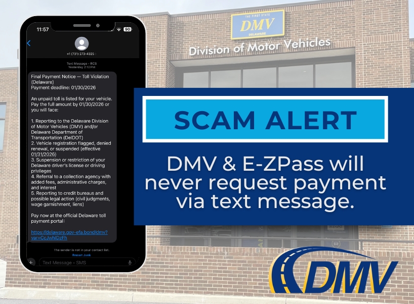 The Delaware DMV urges residents not to click on any links requesting payment for unpaid traffic violations, toll violations, or account replenishments.
