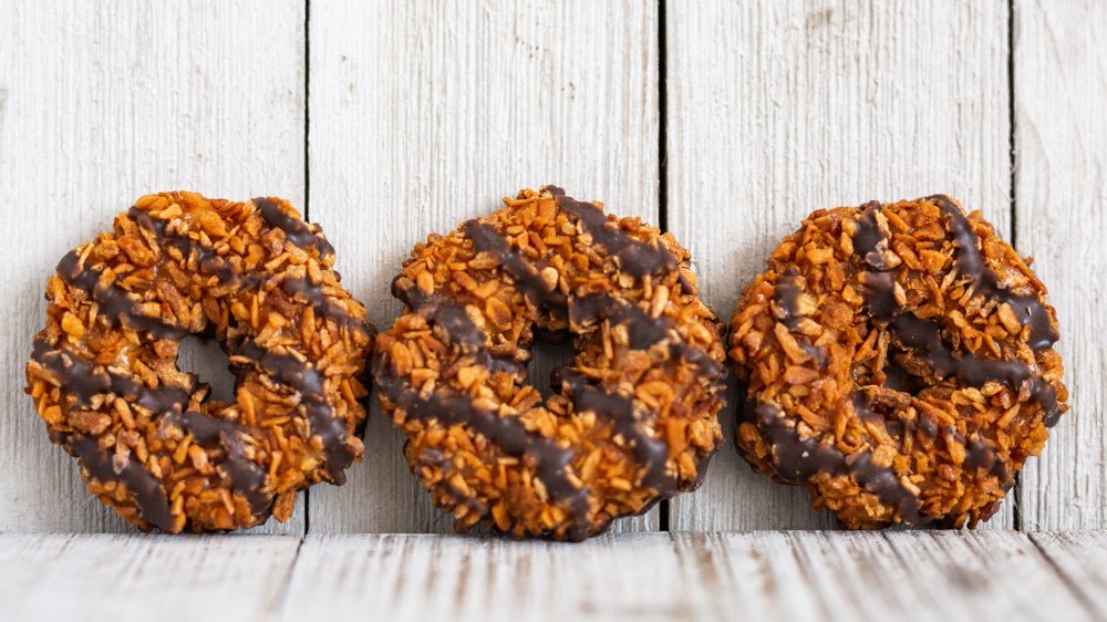 The next cookie that I like is Samos. As NBC reports, “the Samoa was officially introduced in 1976, although Little Brown Bakers claims they were born as early as 1974. Either way, Samoas would quickly become one of the most popular cookies. In 2010, they made up as much as 19 percent of sales, despite being one of the younger cookies.”